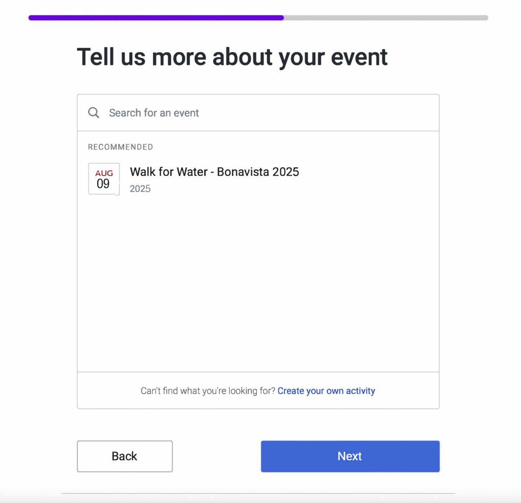 Step 8: Search and select the event “Walk for Water – Bonavista 2025”, and click “next”